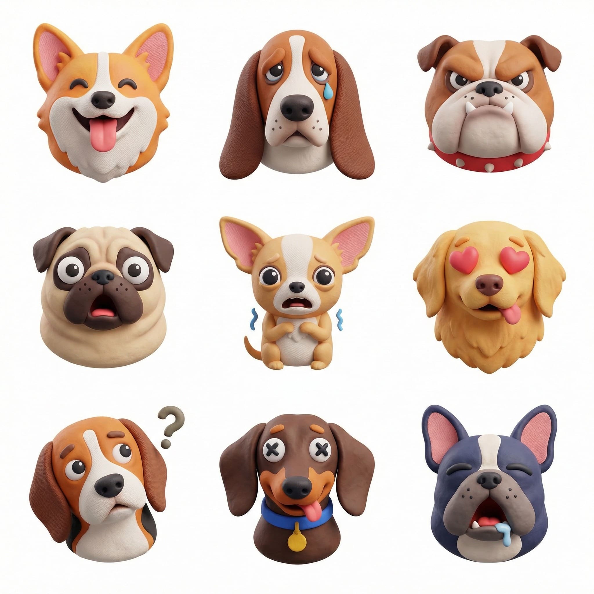 Create a collection of icons representing [a theme], they belong together as a single theme. Put them in a 3x3 grid. The background is white. Make the icons in a colorful and tactile 3D style. No text. - dogs with different emotions - the same cat in different emotions